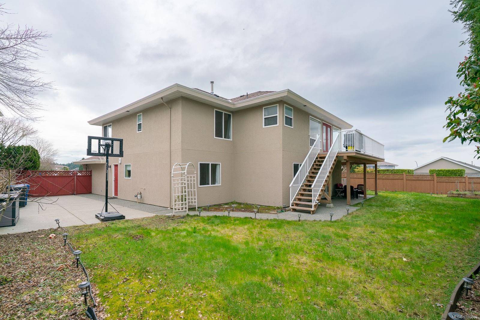 Beautifully maintained, North Nanaimo family home with Ocean view! 6 Bedrooms, 3 Bathrooms including a lovely 2 bedroom suite. This property is located in a quiet, well established North end neighbourhood, within walking distance to Mcgirr and Dover schools, shopping, transit, beaches and parks. Enter on the lower level you are greeted by a curved staircase and welcoming warmth. The lower level offers a bedroom or office, mudroom/storage, and access to the freshly updated 2 bedroom suite. New vinyl flooring, paint, & bathroom vanity in the suite, open concept kitchen and two large bedrooms. The main level boasts tons of bright living space, updated carpets, new gas fireplace 2025. The kitchen is so fresh with quartz countertops, cabinetry, backsplash & lighting done in 2024. The family room and step out deck offer the best ocean view in the house! Further features to note: RV parking with gate and paved pad, irrigation, gardens, gas furnace, new garage doors and openers 2025.